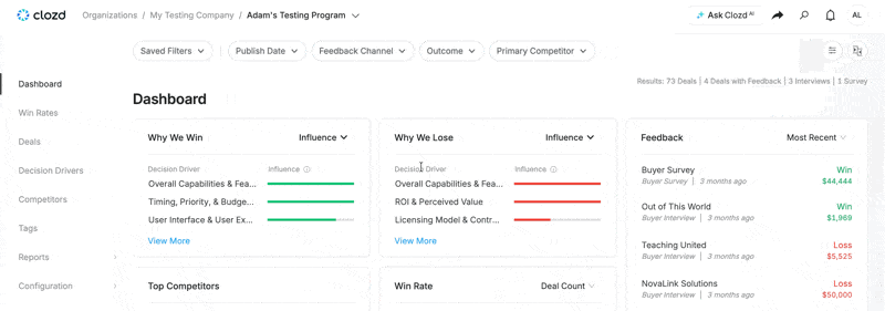 The Clozd Platform integration with Salesforce CRM automates the collection of win-loss feedback by enabling a direct feed of opportunities into the Clozd Platform. The integration streamlines the feedback collection process for win-loss interviews and surveys by reducing the amount of time spent collecting and sharing contact information. Once the integration begins importing the necessary data, the Automated Distributions feature enables you to collect win-loss feedback through interviews and surveys with very little to no ongoing effort.